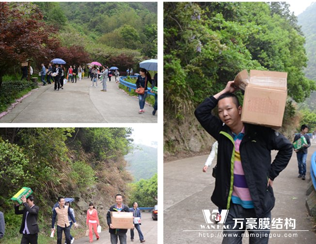 經過1個多小時的車程,到達四明山的腳下,男同事開始搬運中午的美食上山了!