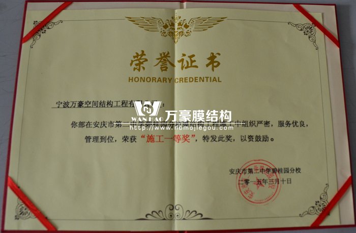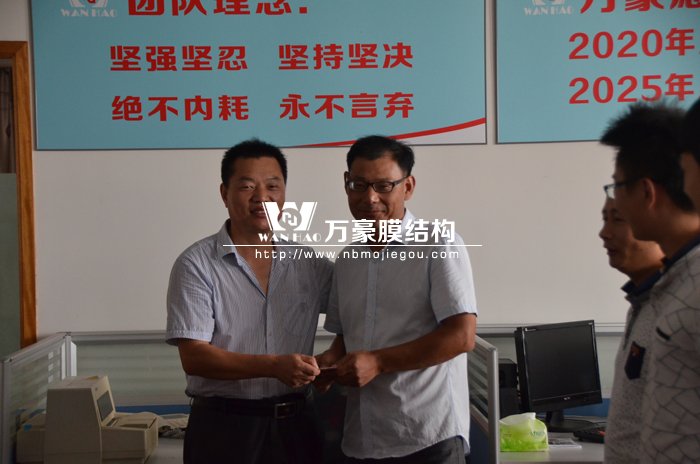 8月7日晨會(huì)上,公司對(duì)項(xiàng)目部汪經(jīng)理進(jìn)行現(xiàn)金獎(jiǎng)勵(lì),汪經(jīng)理管理施工的安慶市第二中學(xué)碧桂園分校膜結(jié)構(gòu)工程獲得安慶市第二中學(xué)的大力贊揚(yáng),并且頒發(fā)了“施工一等獎(jiǎng)”的榮譽(yù)證書,表?yè)P(yáng)了我司在施工中組織嚴(yán)密、服務(wù)優(yōu)良、管理到位。