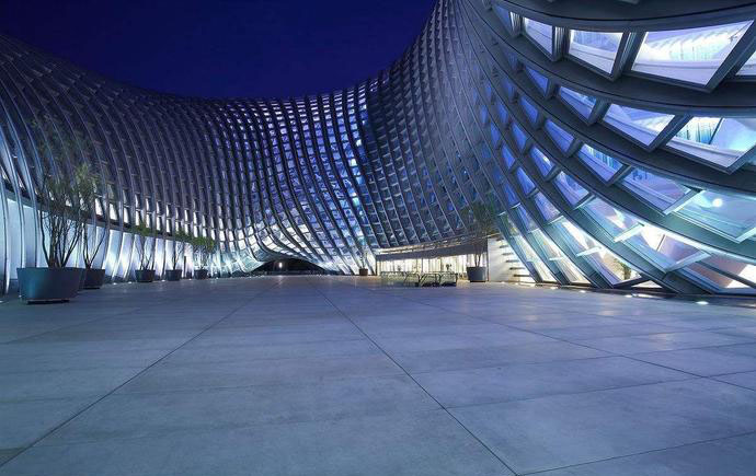 幕墻、結構外殼一體化的設計概念,將張拉膜結構建筑表皮形式、結構和材料構造進行高度的設計整合。它們的界限在創作中實現融合,表皮既是結構,結構也是裝飾,鋼構件、鋁板、幕墻玻璃被技巧性地塑造成一個流暢的張拉膜結構建筑曲面。