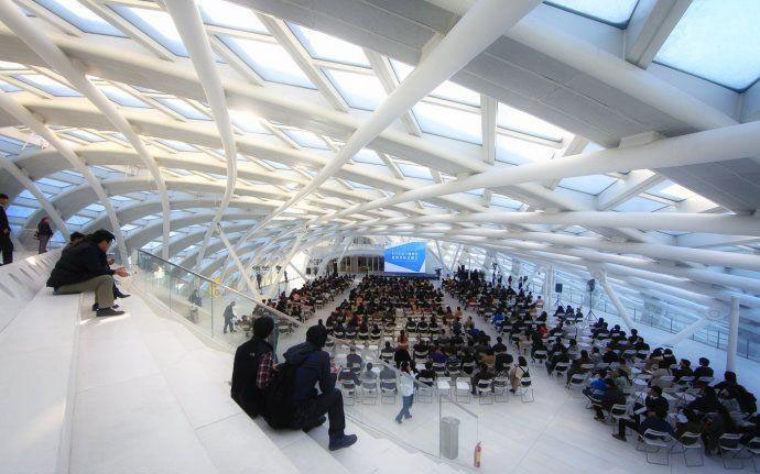 這種“令人捏了一把汗”的設計貫穿在鳳凰中心設計始終。“夢之橋”連接的是演播廳和一個樓頂空間。當大樓設計完成,“樓頂”開闊的地板被連續的莫比烏斯環外殼覆蓋。設計師靈光一閃,決定將這里設計成一個完全對外的開放區域,創造全新的交流場所,取名“樓外樓”。