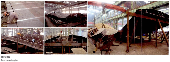 彎扭板材只是完成了第一步,更大的挑戰在于如何將這些板材拼接在一起,“精度”和“進度”成為了加工方的雙重挑戰。以造船技術為基礎,加工方制作了“樣箱”。