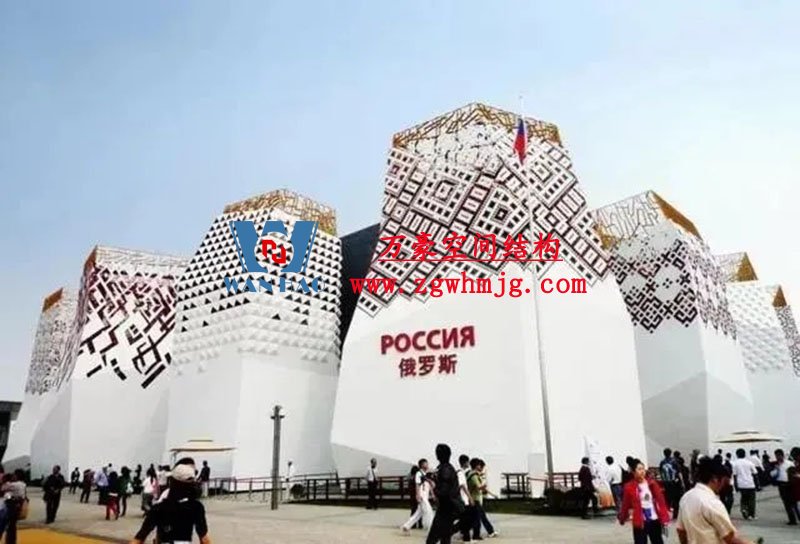 俄羅斯館是4個(gè)保留場館中規(guī)模最大的自建館,由12個(gè)象征著生命之花以及世界之根的白金紅三色塔樓組成,塔樓頂部的鏤空金屬花格各不相同。