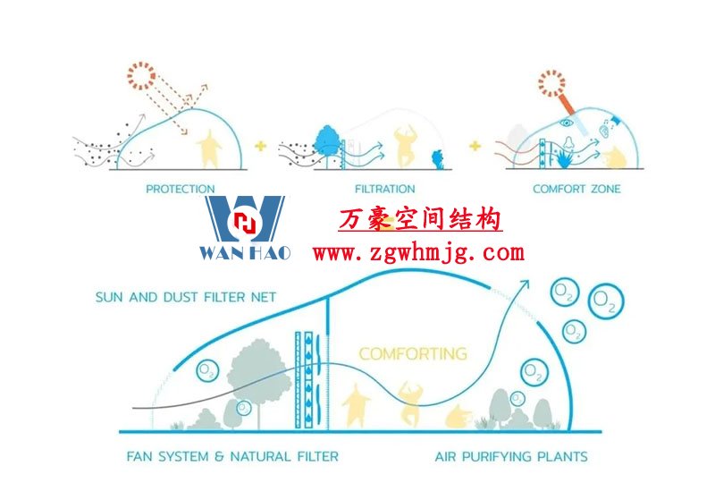 為了保持建筑內部良好的空氣狀況,空氣質量是一個需要細致控制的要素。首先,熱而污濁的空氣被風扇吸入室內,經過成排的樹木和灌木,使得塵土顆粒被吸收;地面覆蓋的植被也能吸收有毒物質。隨后,經過初步過濾的風流過粉塵過濾板和冷卻板,最后形成純凈的風。此外,提供舒適環境也是一個重要議題,因此,安全之家采用了各種技術來保持其內部溫度為22-29攝氏度,以適合泰國的熱帶氣候。