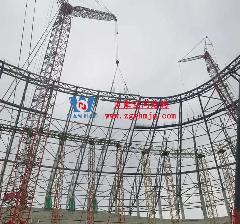 鋼罩棚平衡區長度27m,內部主桁架懸挑長度最大達58m。懸挑部分位于看臺上方,安裝高度高達59.5m。單榀桁架最大單重55t,單根鋼柱重量達60t。