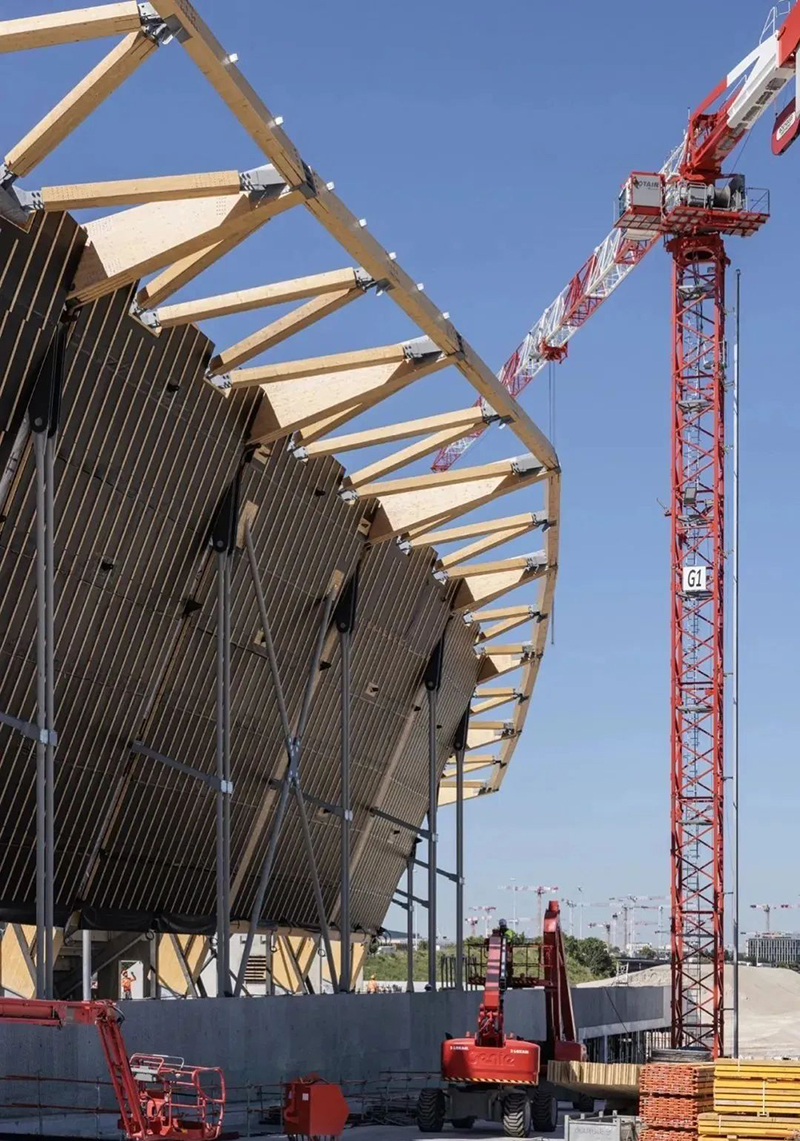 木材是典型的生物基建筑材料之一,是該建筑的主要結構材料。因為木材比其他材料(如混凝土和鋼材)所產生的二氧化碳排放量更少,正好迎合巴黎舉辦歷史上最可持續的運動會的目標。通過在這個巨大的結構中使用木材,該方案將生物材料的使用比例提高了一倍。