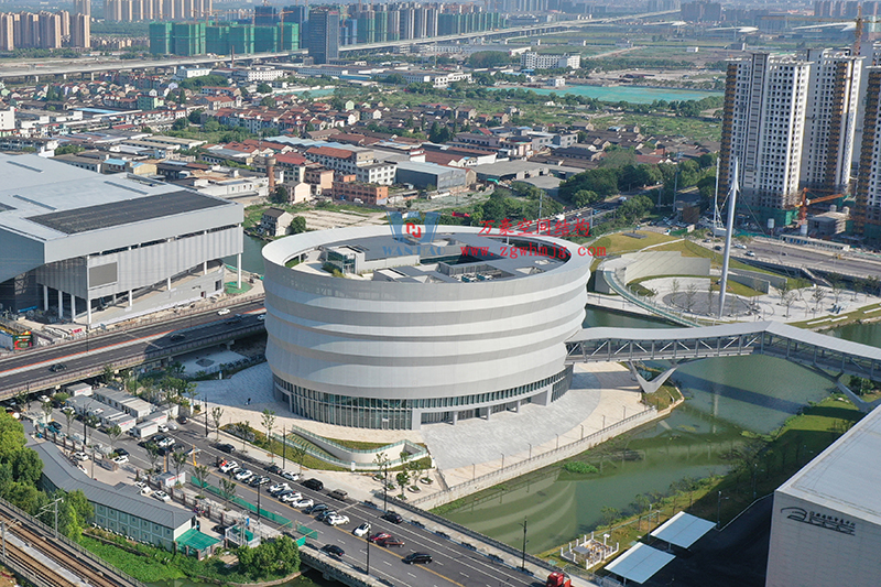 由萬豪承建的紹興國際會展館中心外立面網格織物膜,由5凸5凹不同標高的柔線組合成飄絲帶,視覺效果極具沖擊力。