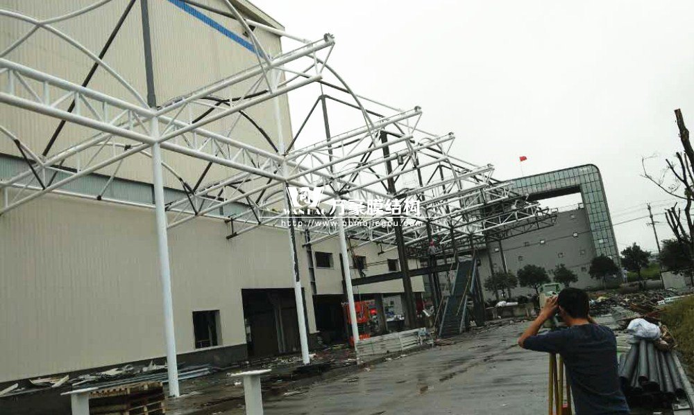 嘉善索菲亞家居膜結(jié)構(gòu)工程就位于嘉善縣的嘉善經(jīng)濟(jì)開發(fā)區(qū)隆全路上。整個(gè)項(xiàng)目總用鋼量達(dá)到了約120噸,膜布投影面積3000㎡。
