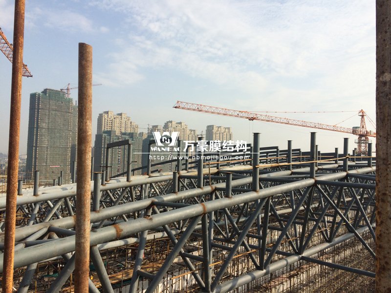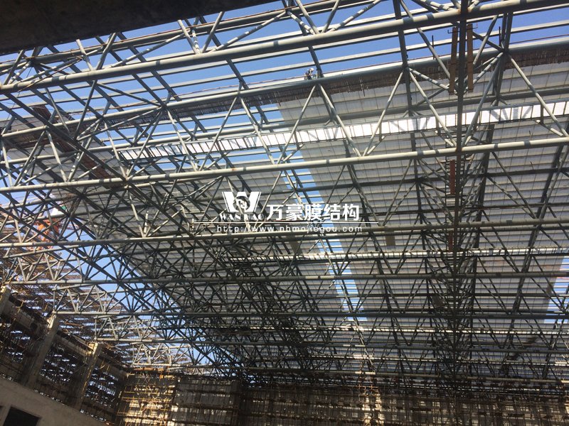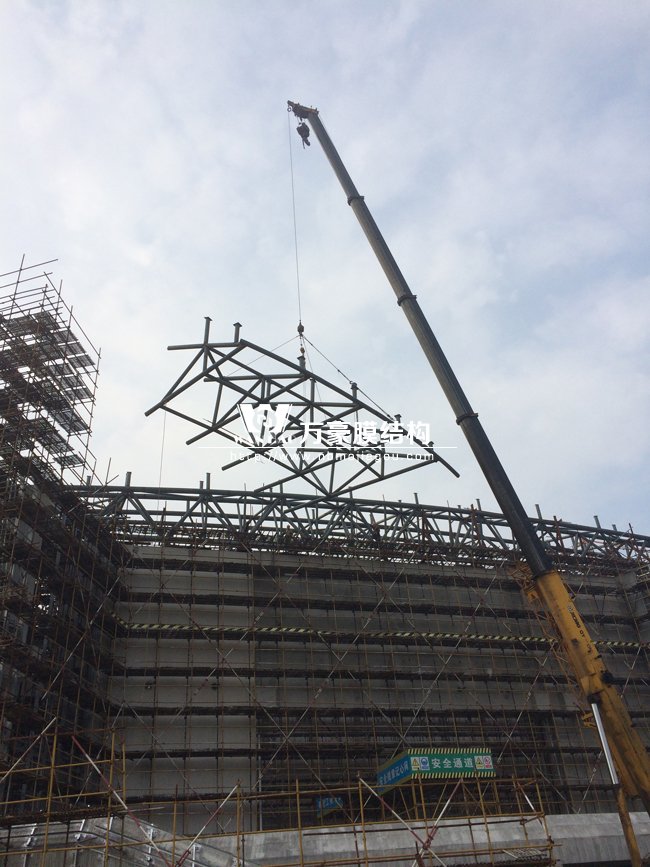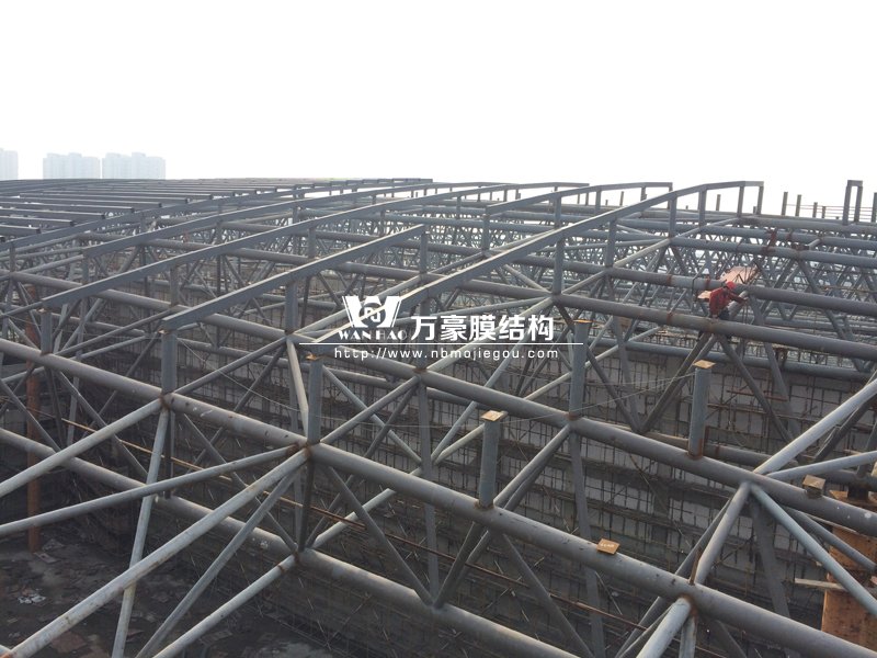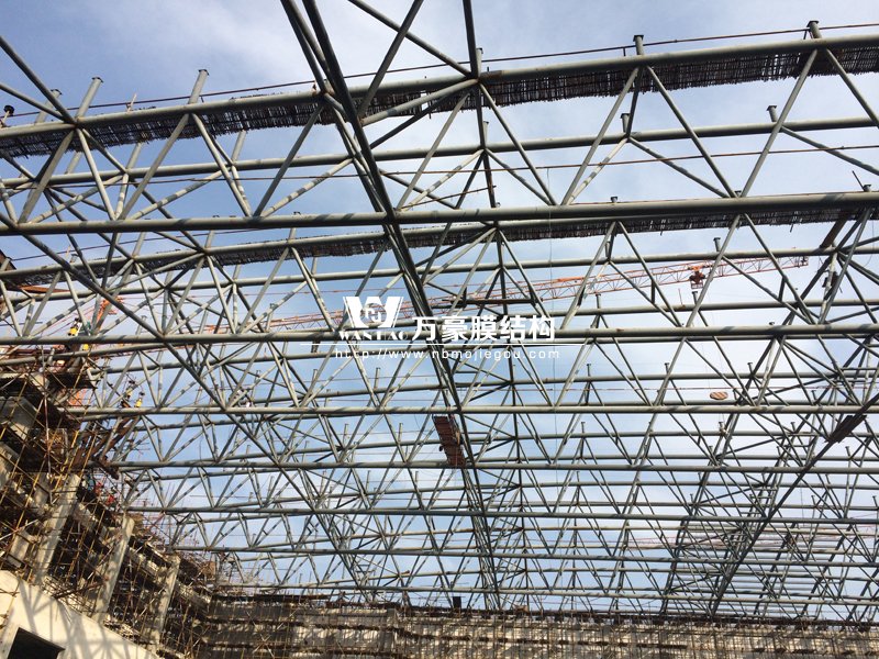 上圖為體育館項目鋼結構現(xiàn)場施工照片,主體結構為三角管桁架結構。
