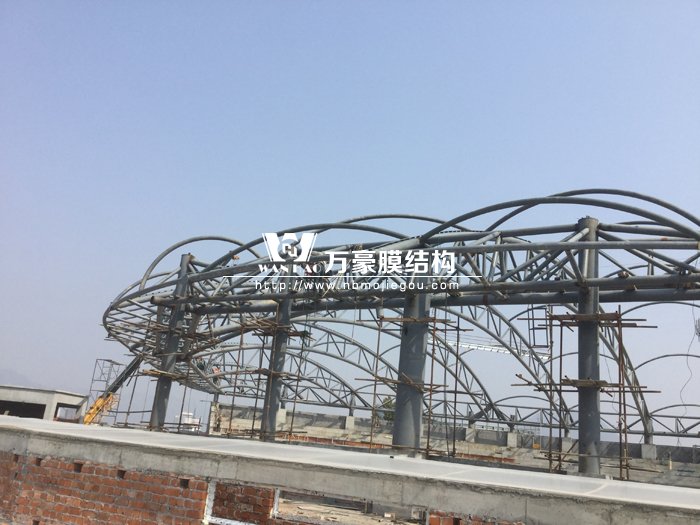 橫店夢幻谷海豚館鋼膜結構,前兩張為鋼結構圖片,后面的是安裝上藍色膜結構后的圖片