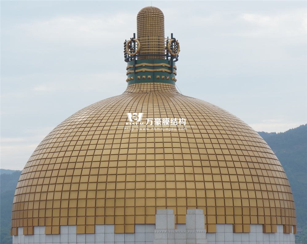 整個穹頂主結構由48根弧形鋼結構勾勒而成,外表面采用8000多塊金色鋁板拼裝完成,由于該項目為圓頂結構,每條緯線部分的每塊鋁板大小各異,因此對主結構加工、安裝精度要求極高,現場以一個平面控制網和48個徑向平面組成控制系統,即以平面代替三維空間,來達到精確、快速的測量定位及校正數據并順利完成施工。
