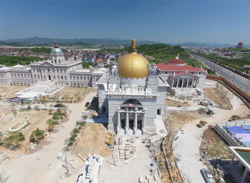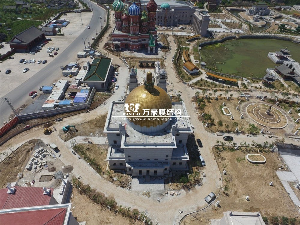 項目坐落于浙江省東陽市橫店影視城圓明新園皇家園林內,奧地利館穹頂結構呈現出一個鍍金大圓頂,完美重塑奧地利施坦霍夫教堂這個奧地利新藝術派令人驚嘆的建筑藝術杰作。