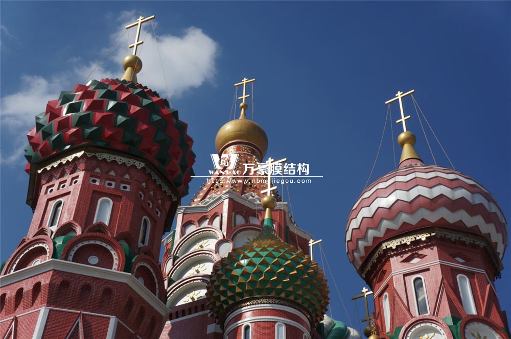 項目坐落于浙江省東陽市橫店影視城圓明新園皇家園林內,金色穹頂標高達61.2米,單個穹頂重量達17噸。穹頂結構充分利用鋼結構異形特性,完美重塑俄羅斯圣瓦西里大教堂的莊嚴宏偉,完美再現圓明園萬國建筑的雍容華貴。