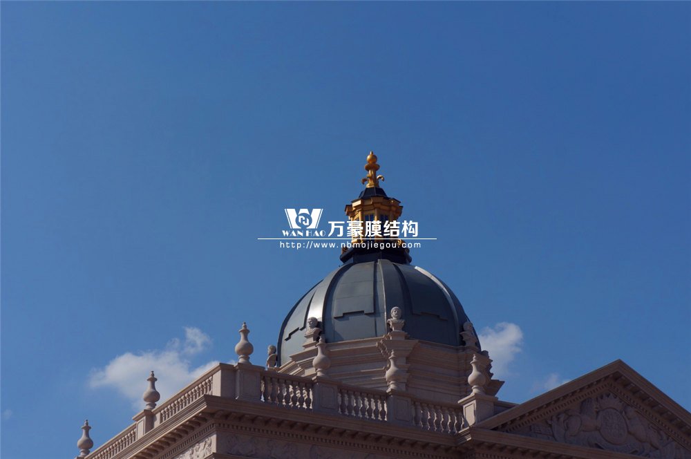整個穹頂主結構采用弧形鋼結構勾勒而成,主結構外表面依三維模型尺寸焊接彎圓后的次龍骨,完成面采用定制加工的雙曲鋁板拼裝而成。