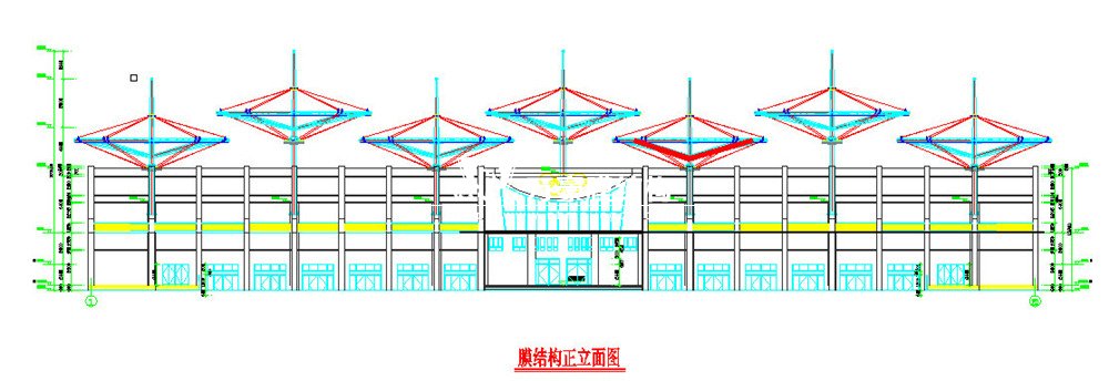 膜結(jié)構(gòu)工程簡(jiǎn)介:膜結(jié)構(gòu)雨棚位于室外看臺(tái)A-E軸/1-20軸區(qū)域。膜結(jié)構(gòu)雨棚采用張拉索膜結(jié)構(gòu),膜材采用進(jìn)口法拉利1502t2膜材,雨棚柱頂標(biāo)高32.643米,由7個(gè)長(zhǎng)30.08米,寬17.38米的倒傘形狀的單體組成。