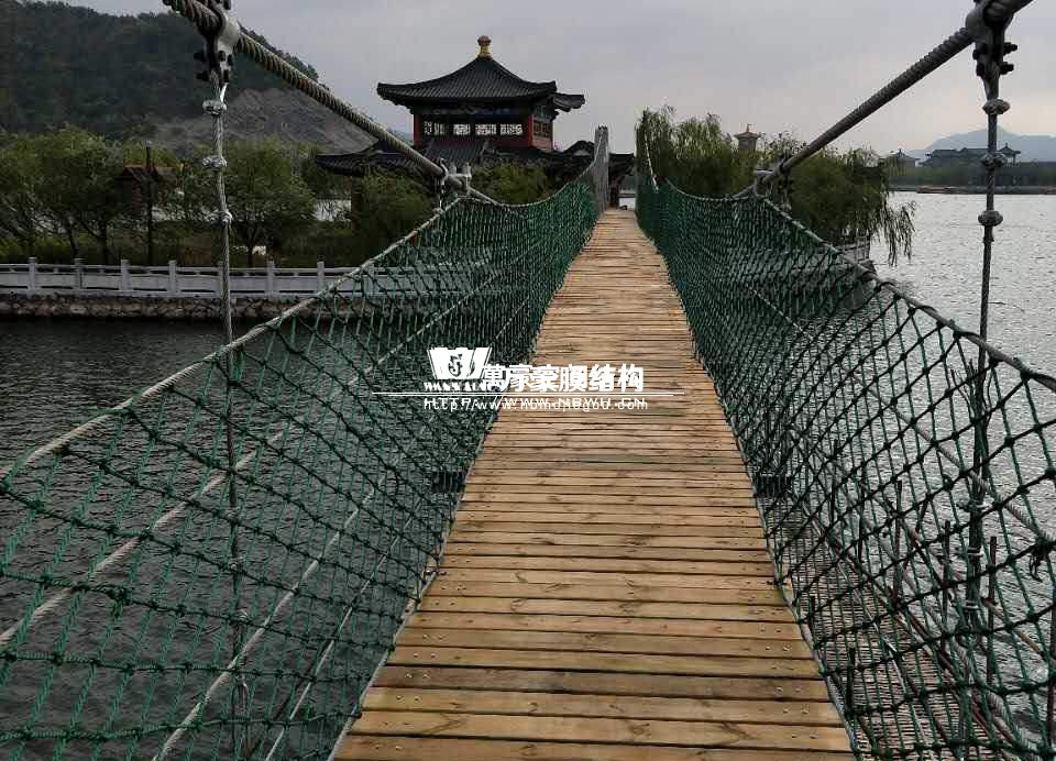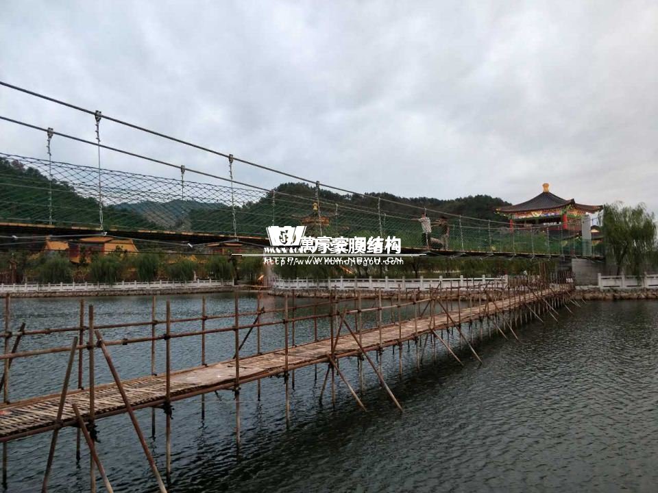 該橋采用8根柔性鋼絲繩,4支立柱作為受力構(gòu)件,橋面采用組合型鋼作為支撐面,上鋪防腐木枋板。根據(jù)橋面與水位的相對高程,吊橋主跨為65m。該橋橋面凈寬度為1.5m,吊橋橋面總寬度2.0m。上鋪4公分厚的防腐木枋板。最多可承受130人行走,橋下能自由通行龍船。符合景區(qū)游客娛樂性游玩與功能性通行的完美結(jié)合在一起。