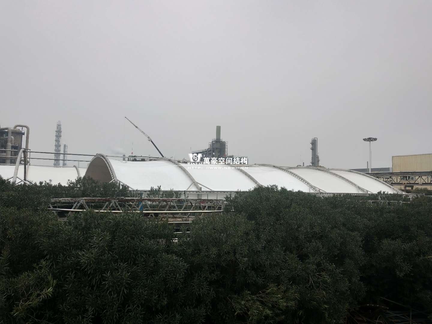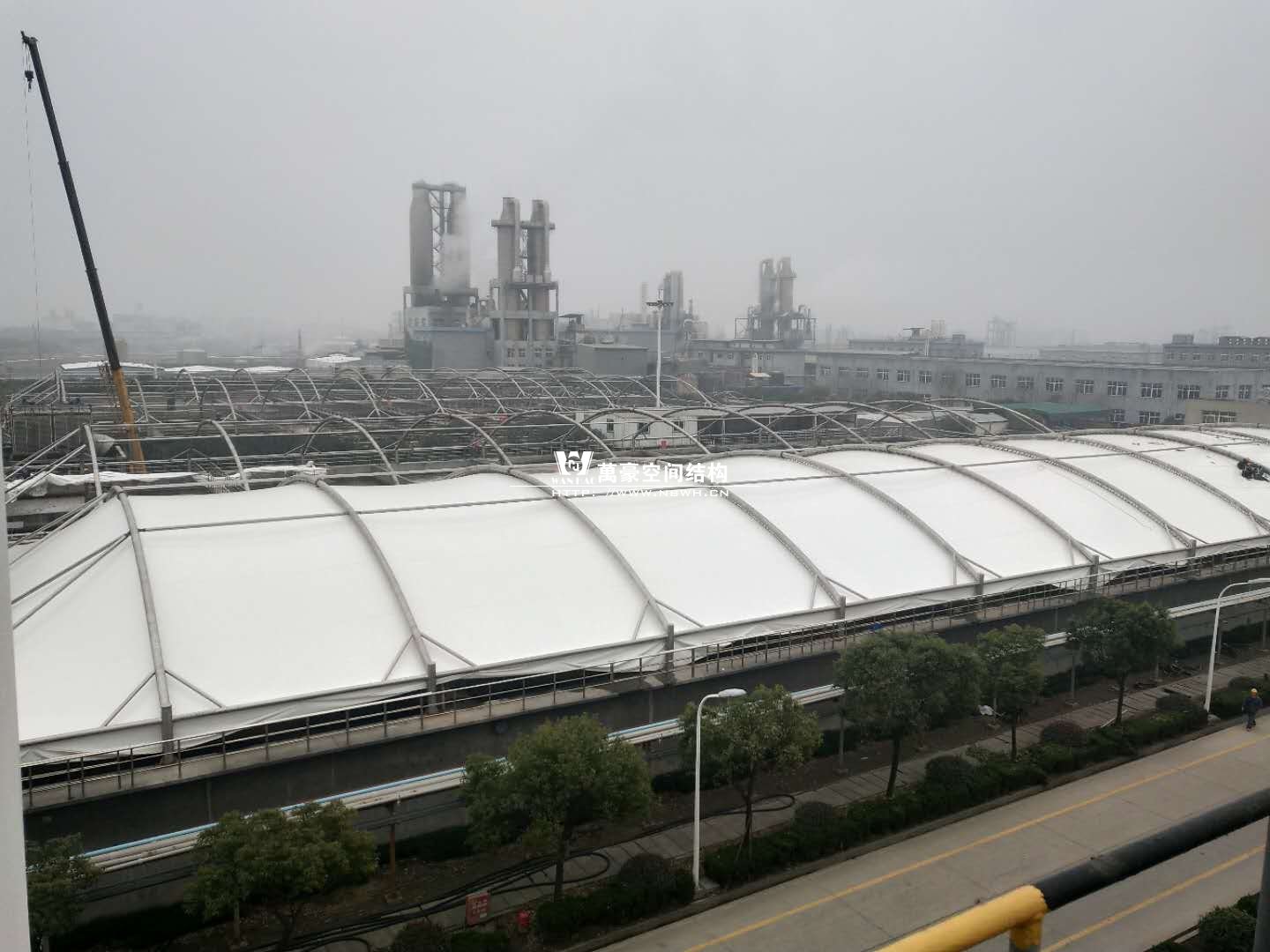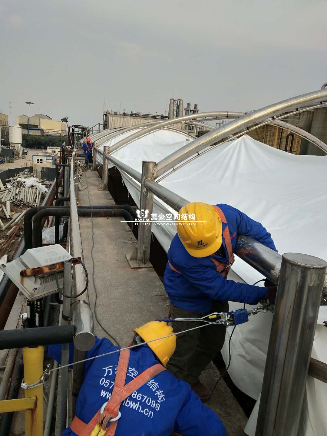 東廠區生化池加蓋工程,坐落于浙江省紹興市杭州灣上虞經濟開發區龍盛科技園內。整個項目由A/O池加蓋4座、二沉池加固定蓋4座、濃縮池加蓋2座、氧化池加蓋1座、氧化氣浮池加蓋1座、氧化集水池加蓋1座、出水調節池1座、安諾池1座,共計15座鋼膜結構組成。總用鋼量達350噸,總建筑面積達35000平方米。