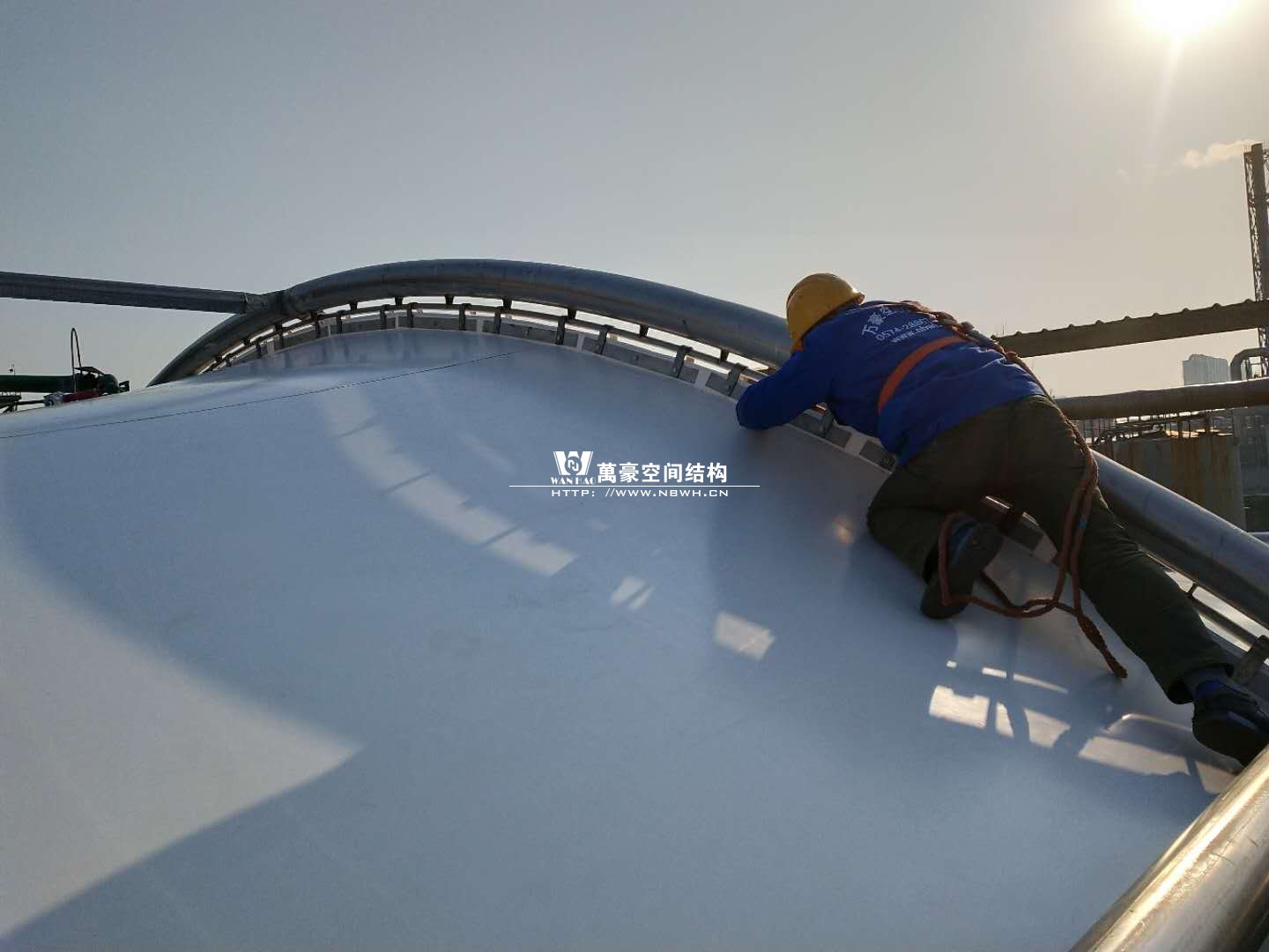 鋼結構全部選用304不銹鋼材質,所有鋼柱與混泥土結構連接采用注射式化學粘結螺栓-高強乙烯基樹脂砂漿。因污水池的特殊性,保證鋼結構不予污水直接接觸,全部采用了倒掛式膜結構。