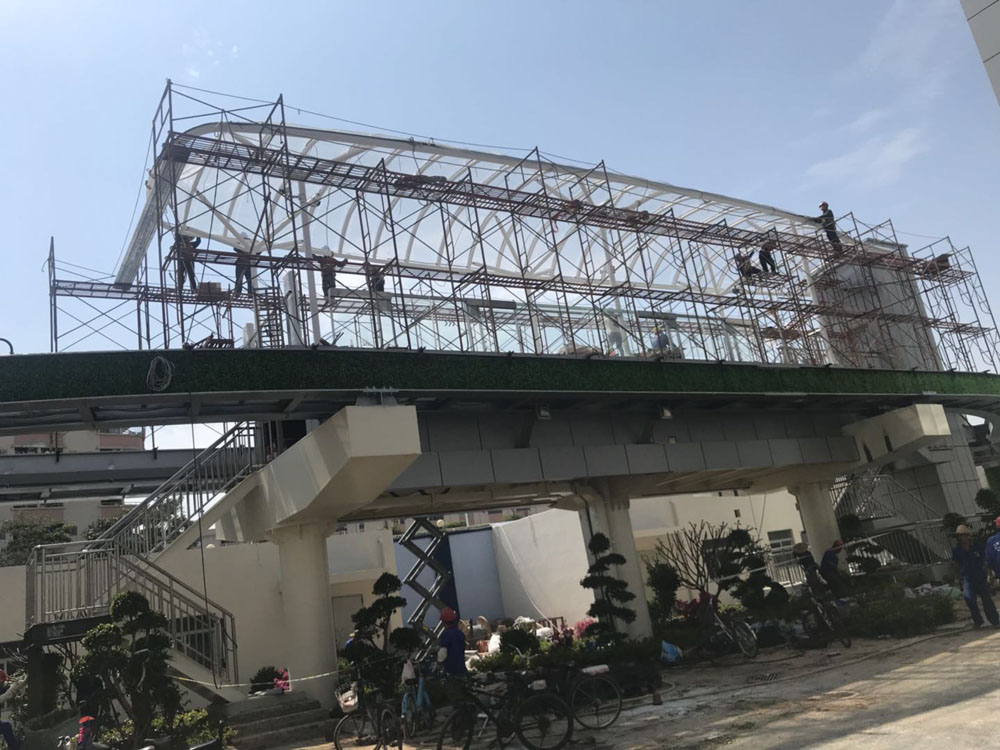 云巴園區(qū)試驗(yàn)示范線工程由寧波萬豪空間結(jié)構(gòu)工程有限公司深化、制作及安裝,工程質(zhì)量?jī)?yōu)質(zhì),該工程造型比較新穎,與創(chuàng)新云軌相融為人員集散中心的云軌站站臺(tái),相比地鐵站更具美觀性!云巴園區(qū)試驗(yàn)示范線工程-四角站,遮蓋材質(zhì)選用最為優(yōu)質(zhì)的ETFE膜材(日本旭硝子),這種膜材料的最大亮點(diǎn)是:透光性加上防紫外線的特性保證了其使用功能和美觀性!鋼構(gòu)則選用了起拱和各種大小圓弧相融合。寧波萬豪空間結(jié)構(gòu)工程有限公司對(duì)加工精度和安裝精度做出了高標(biāo)準(zhǔn)的典范!