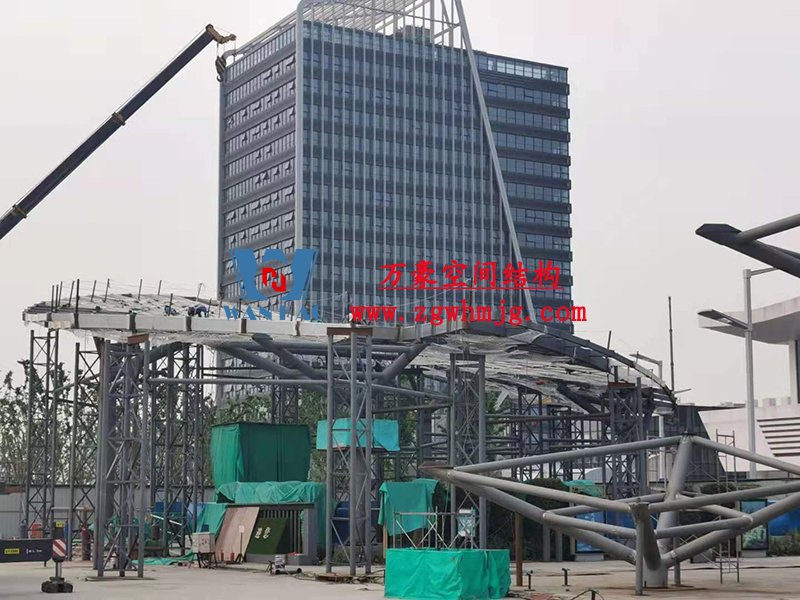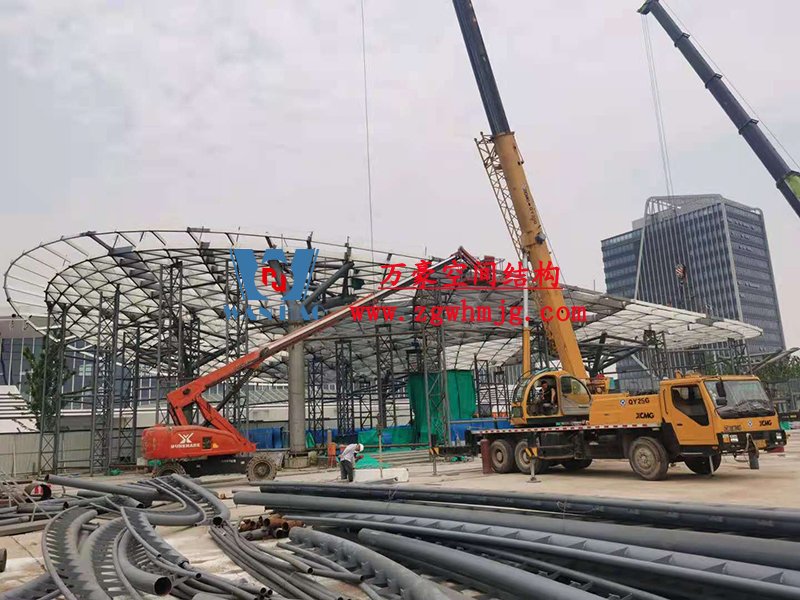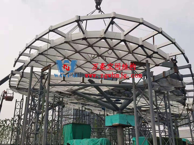 本工程鋼結構為單層雙曲網殼結構體系,平面上為對稱結構,大翅膀長跨約 50m,短跨約 25m,小翅膀長跨約 35m,短跨方向約 15m。建筑頂面為雙曲造型,建筑物最高點標高約17米。總用鋼量800噸,膜體總面積約7000平方米。 目前,左大翅膀最后一榀吊裝完成,開始拼裝右大翅膀。