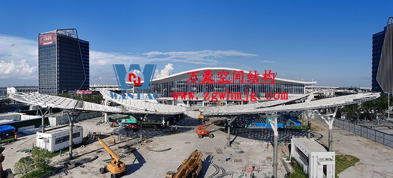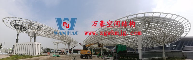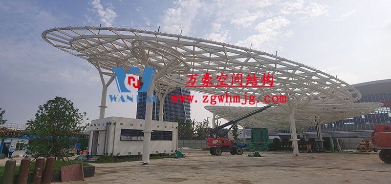本工程鋼結構為單層雙曲網殼結構體系,平面上為對稱結構,大翅膀長跨約 50m,短跨約 25m,小翅膀長跨約 35m,短跨方向約 15m。建筑頂面為雙曲造型,建筑物最高點標高約17米。總用鋼量800噸,膜體總面積約7000平方米。
