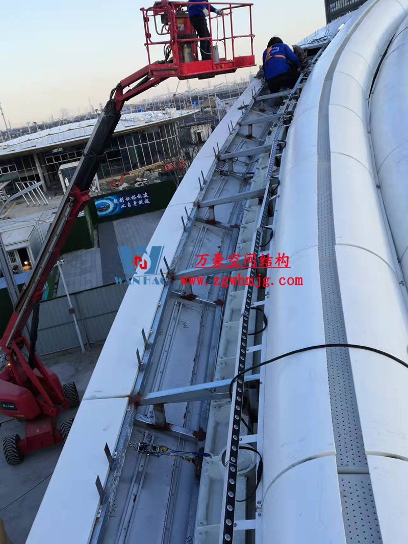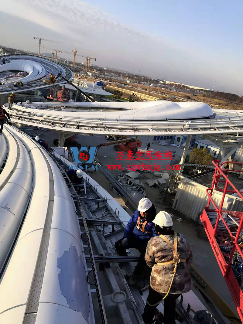 本工程鋼結構為單層雙曲網殼結構體系,平面上為對稱結構,大翅膀長跨約 50m,短跨約 25m,小翅膀長跨約 35m,短跨方向約 15m。建筑頂面為雙曲造型,建筑物最高點標高約17米。總用鋼量800噸,膜體總面積約7000平方米。