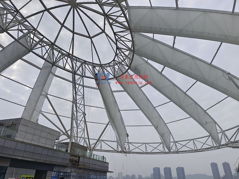 南充萬達項目鋼膜結構ETFE蓋頂天幕工程,該項目總用鋼量500噸,其中主體鋼結構400噸,二次鋼結構100噸,膜材展開面積總計13500平米,其中ETFE膜(俗稱“軟玻璃”)7000平米,二氧化鈦高自潔涂層PVDF膜6500平米。本項目作為四川省南充市萬達廣場新地標商業綜合體配套設施,建成后將成為南充市又一經典之作。