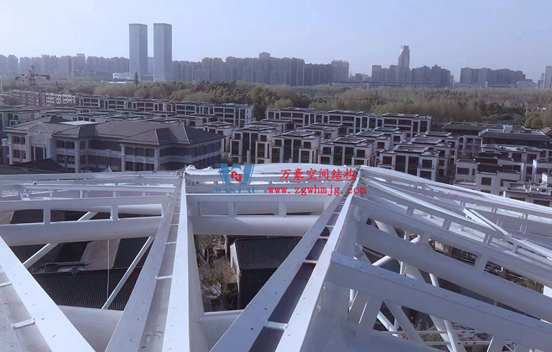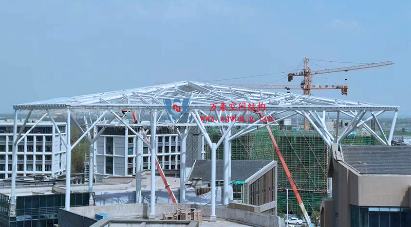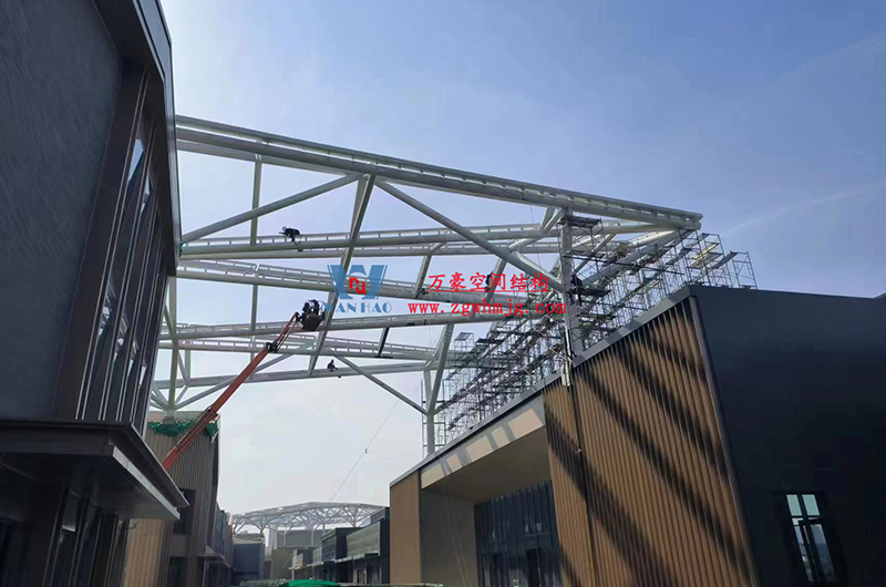 文一塘溪津門天幕鋼結構及ETFE氣枕膜工程由寧波萬豪空間結構工程有限公司承建,該項目用鋼量900噸,膜結構展開面積7000平米。今年以來,萬豪施工團隊緊抓時間節點,工程進度推進迅速。