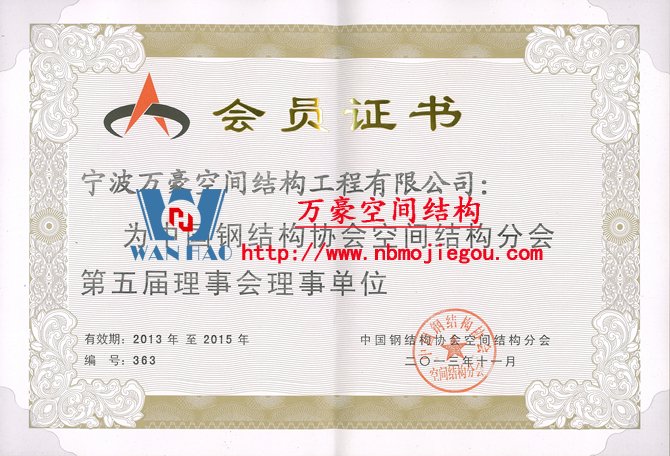 我司(寧波萬(wàn)豪空間結(jié)構(gòu)工程有限公司)在本次會(huì)議上榮獲“中國(guó)鋼結(jié)構(gòu)協(xié)會(huì)空間結(jié)構(gòu)分會(huì)理事單位”。